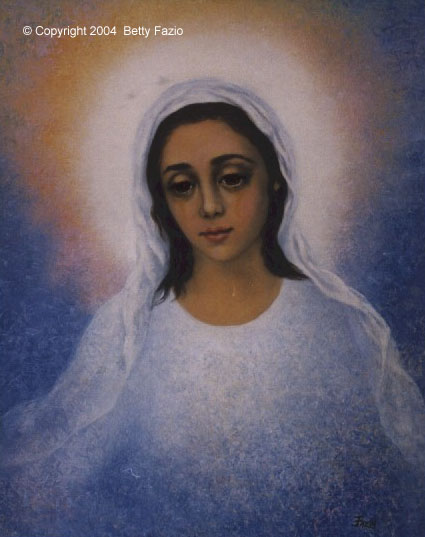 While painting this portrayal of the Blessed Mother, I was at the same time praying for someone dear to me. I stopped painting for a while to rest my back but continued in intercession. Several minutes later, I looked up at the painting, surprised to see that she looked like she was crying, and had a streak of golden tears running down each of her cheeks. I had not painted them there, nor even though of painting her crying.