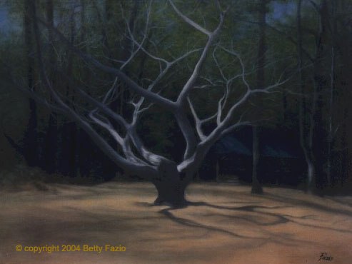 In the painting, this "entity" (tree) consumes it's space with both it's loneliness and it's strength. It's root live timelessly in the soil made barren by many human feet. It ever beckons to us, inviting us to enter into it's secret. We respond, desiring to climb it's branches. Yet in it's wisdom, allows us only to sit nearby. In the soft glow of light upon the tree and blanketing it's space, we are called again, yet the tree remains alone in it's strange, mysterious life.